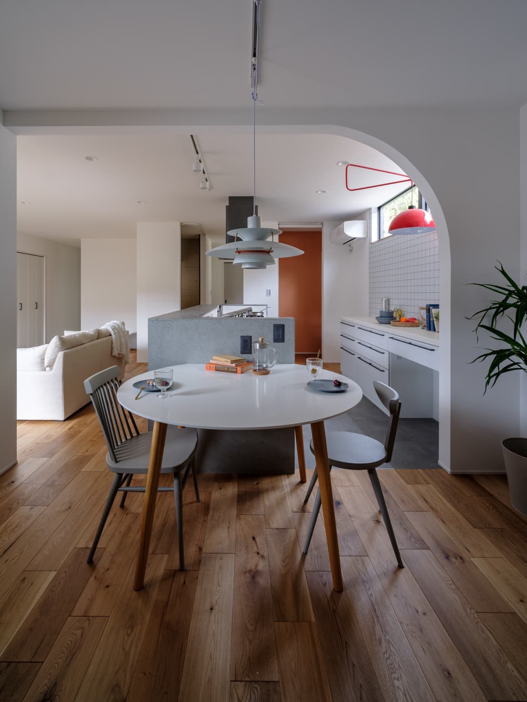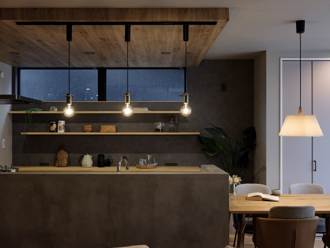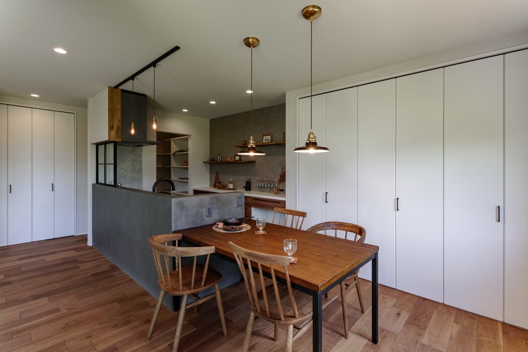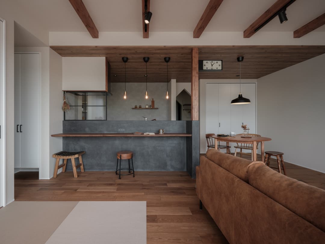 キッチンカウンターは、ちょっとしたコーヒータイムや子どもの宿題スペースとしても活躍します。天板や椅子にこだわるだけで、カフェのような雰囲気に。自然と家族が集まる場所になります。