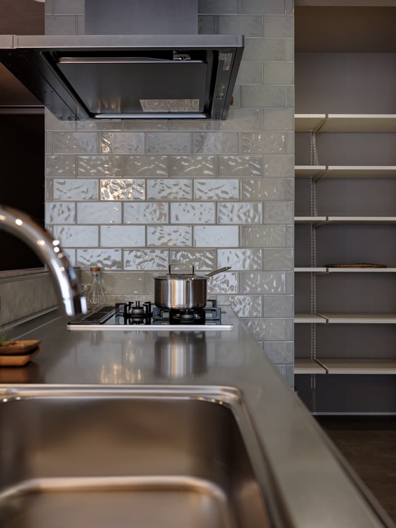 アクセントとなるタイル壁が、キッチンの印象をグッと引き締めています。