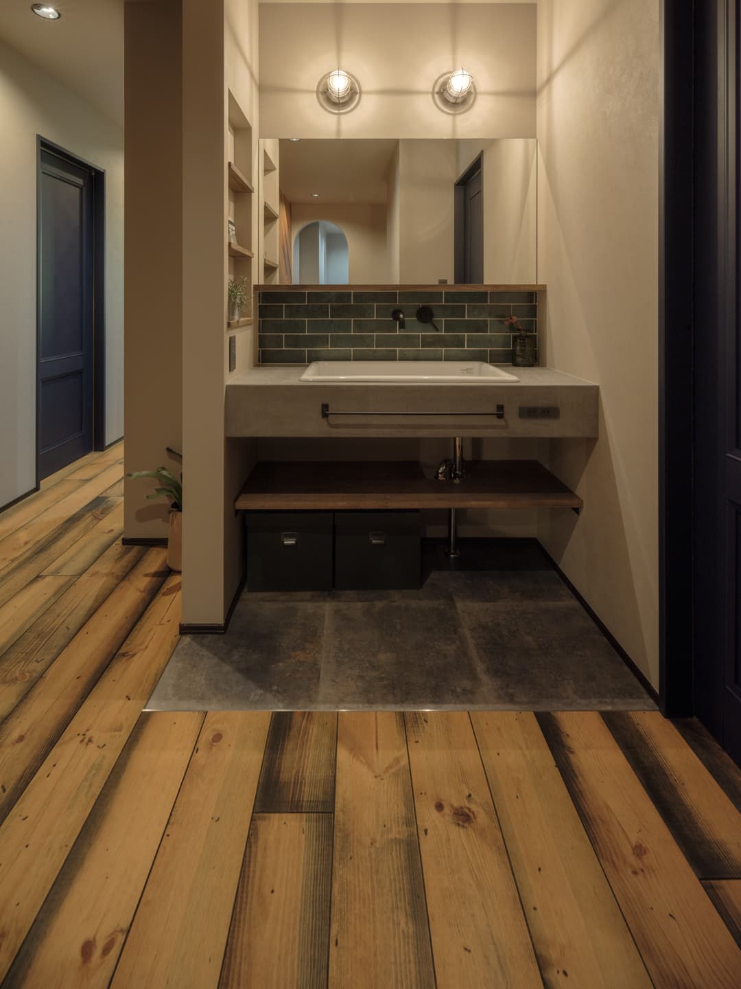 このお家では、洗面スペースを“通路の一部”ではなく、ゆとりある独立空間として設計。