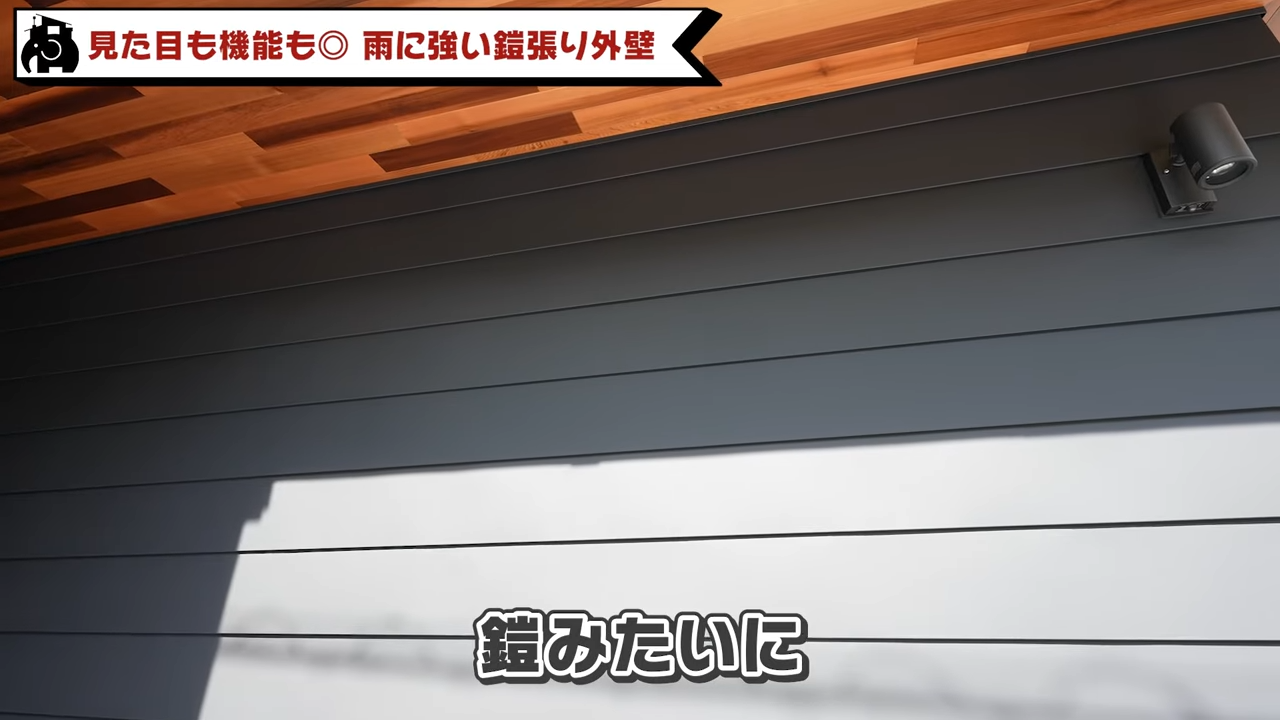 先に内装のテイストをご紹介したあと、大島が外壁と玄関のポイントに触れます。今回の外壁は1階と2階でガルバリウムの使い方を変えているのですが、注目していただきたいのが1階の鎧(よろい)張り。まるで兵士の鎧のようにガルバの板が重なっている意匠で、雨が降っても全部外へ流れていくような造りになっています。一部レッドシダーも使用されています。