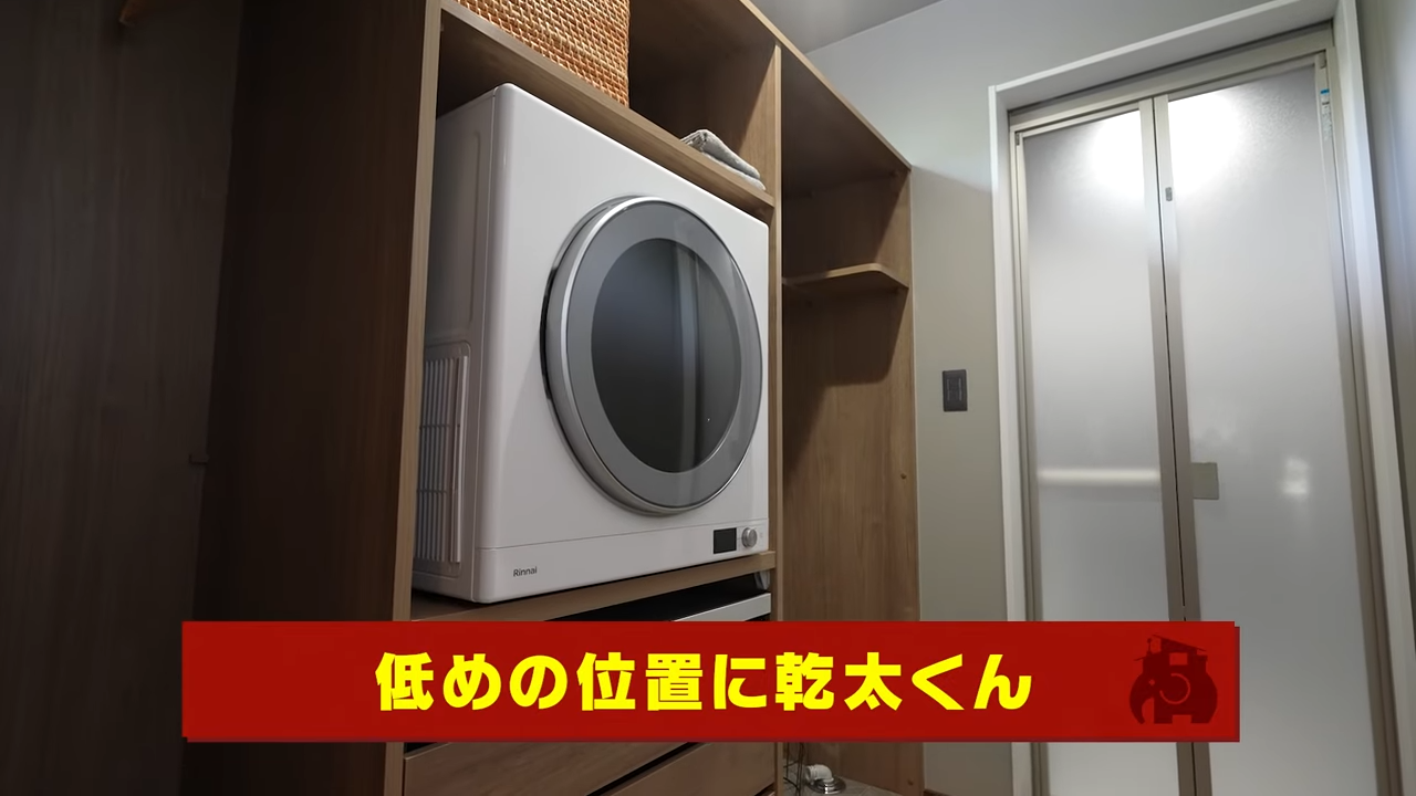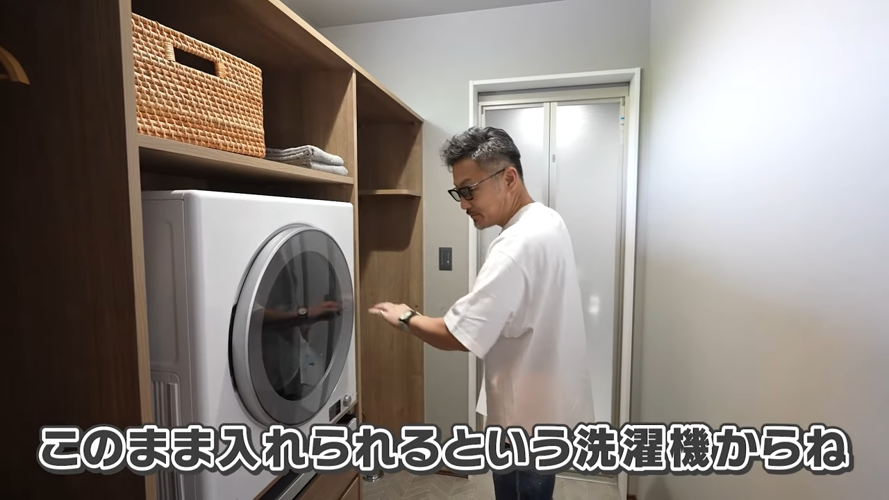 隣の脱衣室は2.5帖。洗濯機の上に乾燥機を付けるのが一般的ではありますが、女性の身長を考えて低めの位置に幹太くんを設置しています。乾燥機の上下にはしっかり収納できる棚もあり、使いやすさを第一に考えた設計になっています。