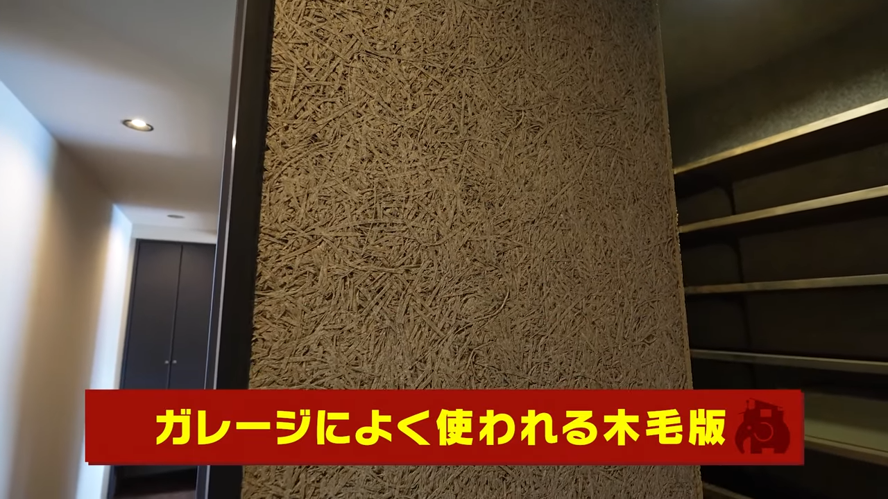 玄関の横には、たっぷり収納できるシューズクローゼットがあります。かなり広く、収納には困らない大きさです。クローゼット内の壁は木毛版(もくもうばん)という、ガレージによく使われる素材を使用しています。セメントが混ぜてあるため燃えにくいというのが特徴です。ここもまた、際立った見た目ですよね。