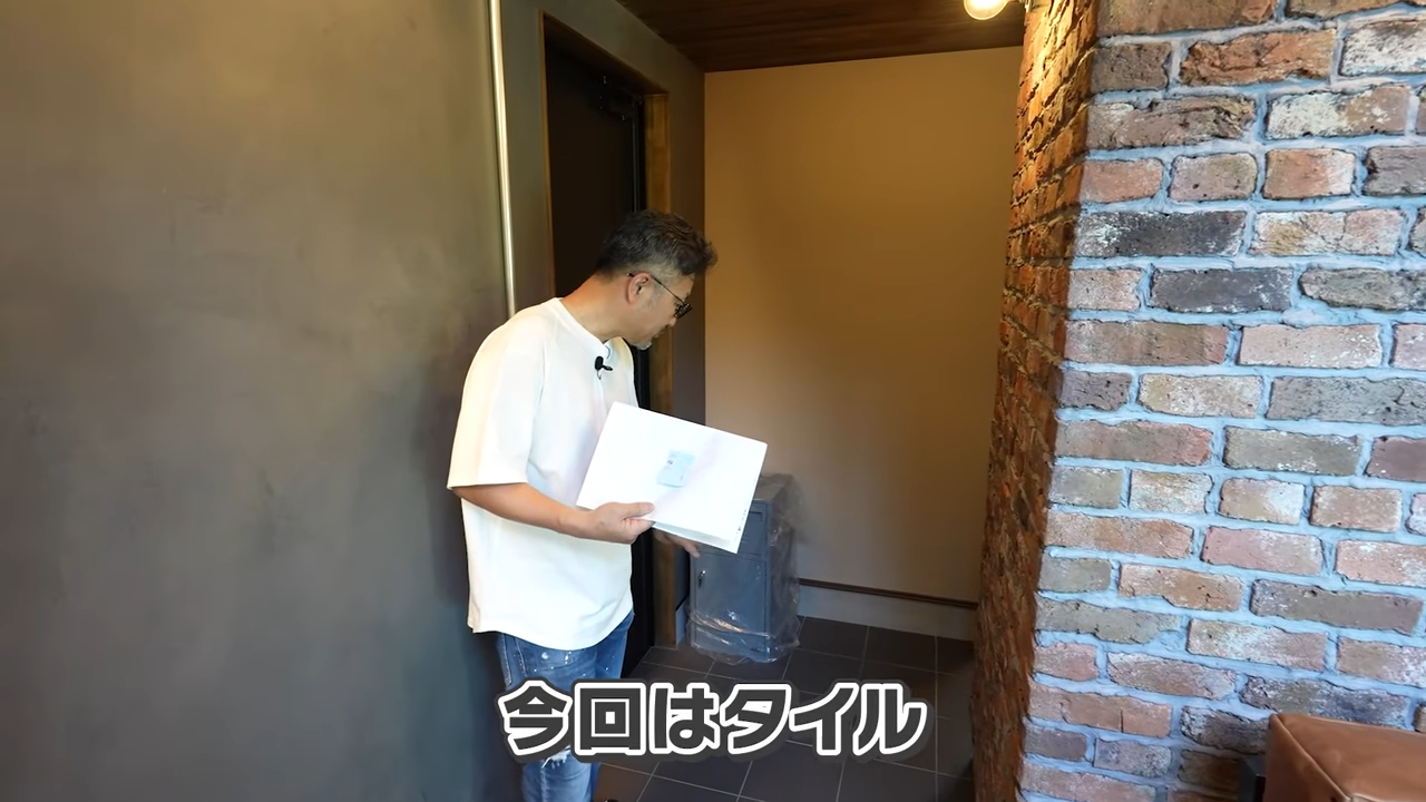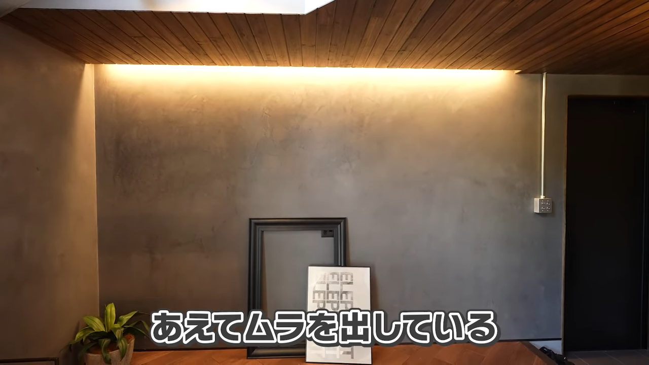 この漆喰の塗り方にも工夫がされており、わざと綺麗に仕上げず、左官の技術を使ってムラを出した話をしています。周辺のトグルスイッチや真ちゅうの照明との雰囲気もぴったりです。
