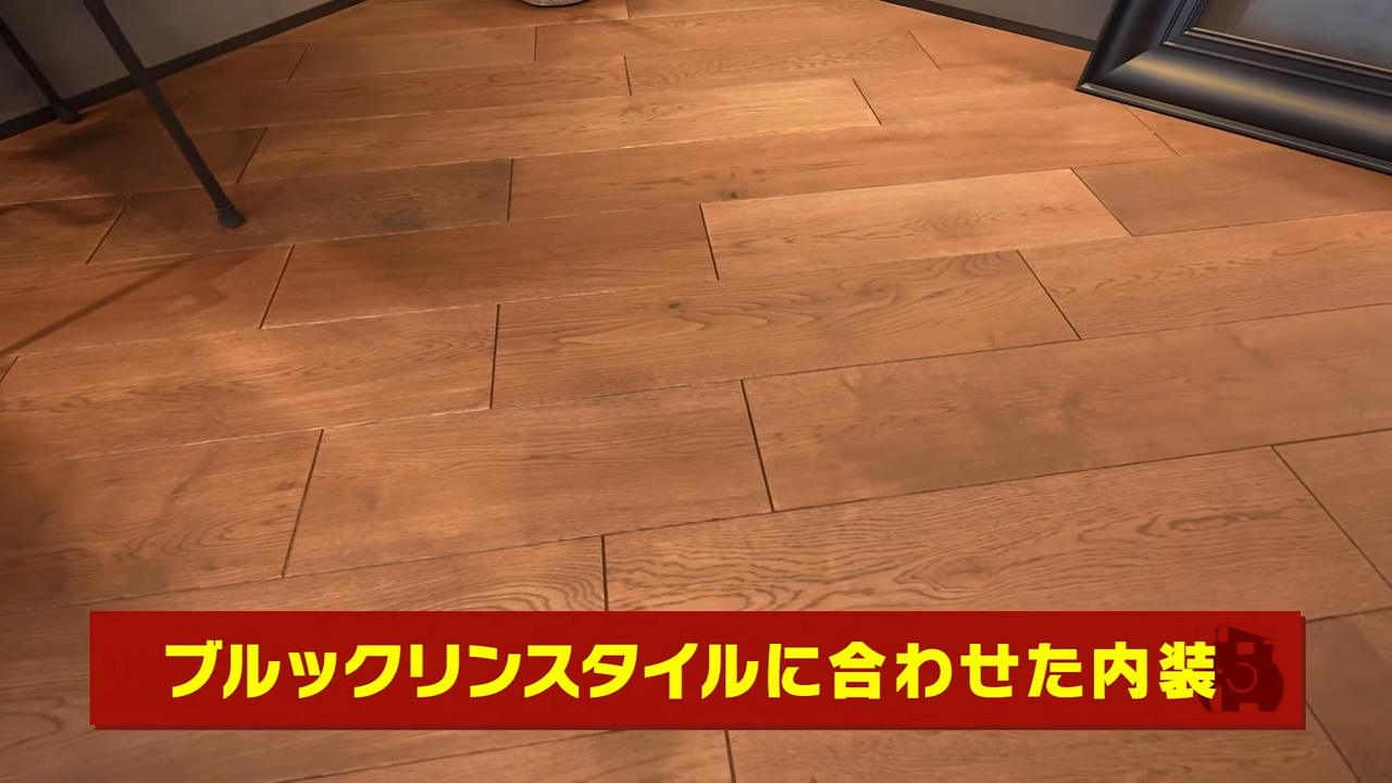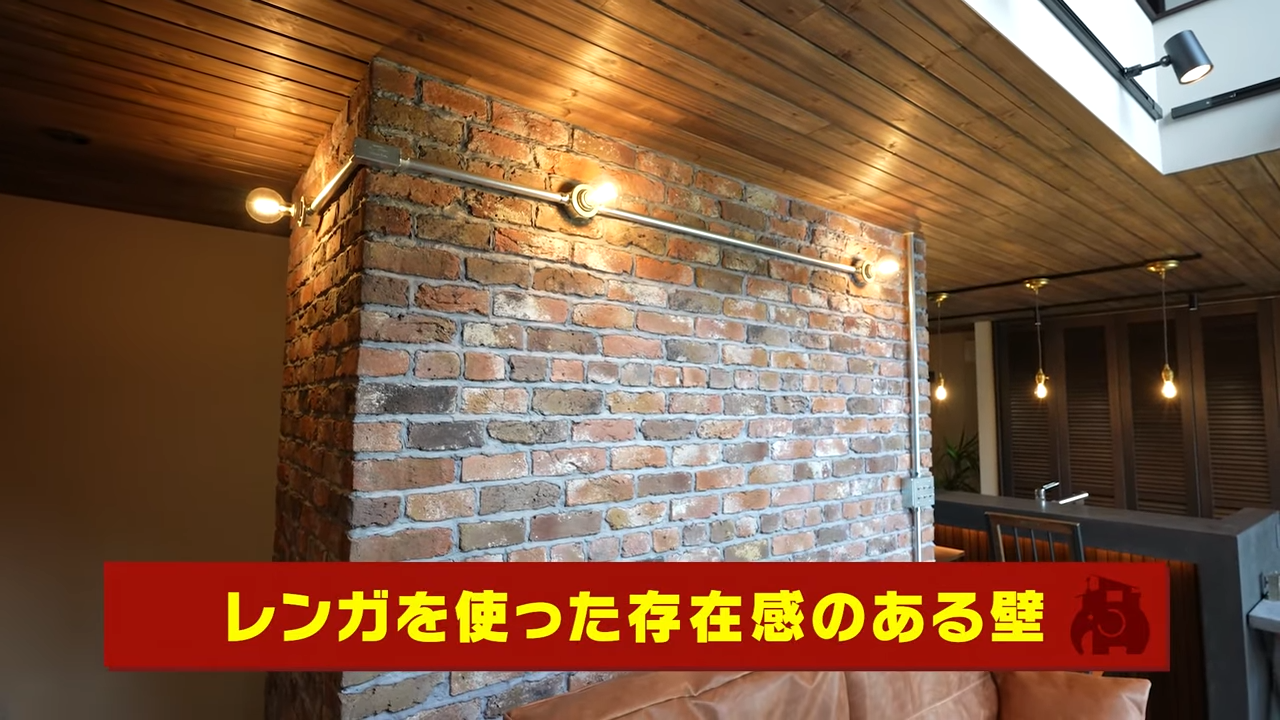 室内の解説に戻ります。中の壁や床も、ブルックリンスタイルのためにデザインを工夫しています。壁には、一般的なレンガを薄く加工したものを埋め込んで使用。しかも、ただ綺麗に並べられているわけではありません。あえて大きさにばらつきを持たせ、不完全な表情を演出させるため凸凹にしています。配線を露出させているところにもアメリカスタイルの無骨さが感じられますよね。