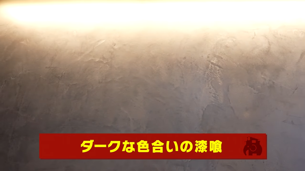 別の壁面では、漆喰を使用しています。部屋の雰囲気に合わせるために漆喰に色粉を混ぜ、グレーの壁をつくりました。かなりダークさが感じられますよね。
