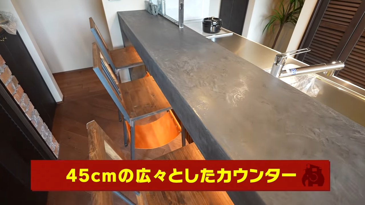 キッチンのカウンターは45㎝とかなり広め。この椅子はお施主様が持ち込まれたもので、椅子に合わせてカウンターのテイストが決まりました。まるで小さなバーのような空間が広がっていますよね。