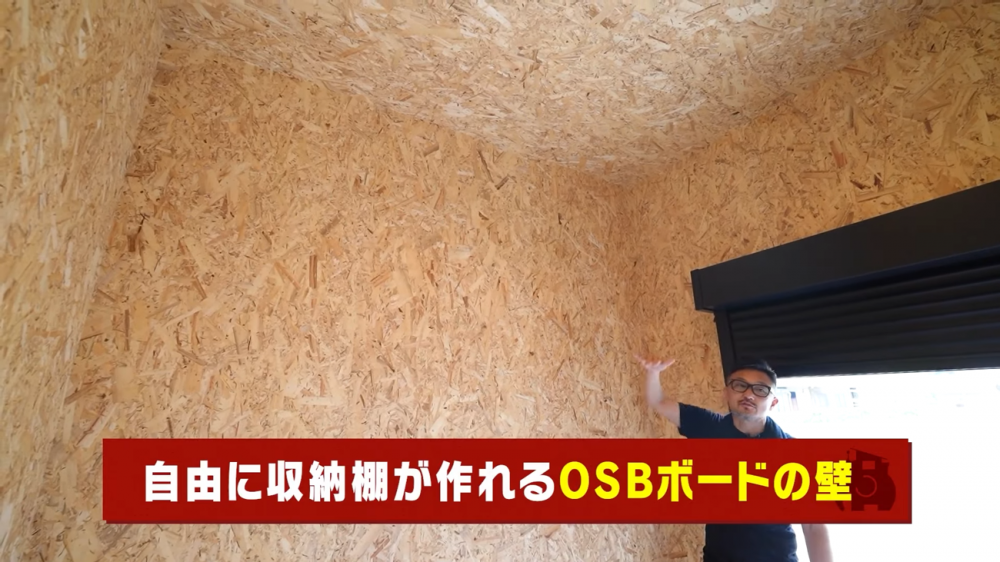 インナーガレージの壁面は、OSBボード。ご自身で釘を打ったりして、自由に棚板などを付けられる材料です。