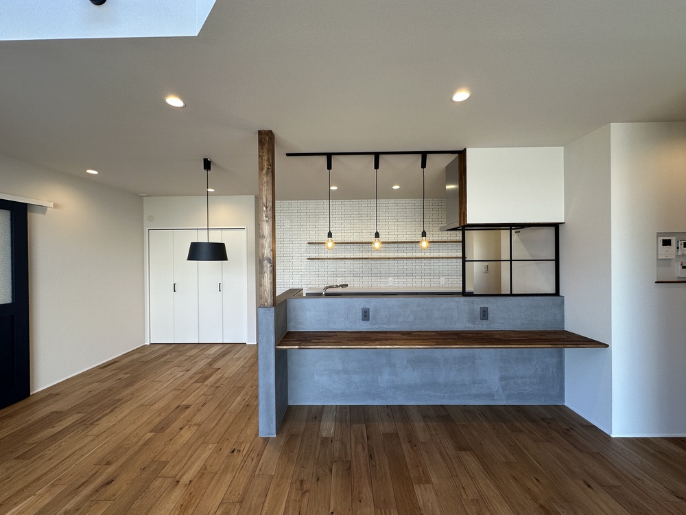 こだわりの外観から一歩お家の中に入ると、明るく開放的な空間が広がっています。昼間は電気をつけなくても明るいLDK。キッチンから見渡せる家族の様子。随所にみられるアクセントは3色に絞った展開で、イメージが散らからないけどしっかり個性の出る内観です。(畳スペース施工中)