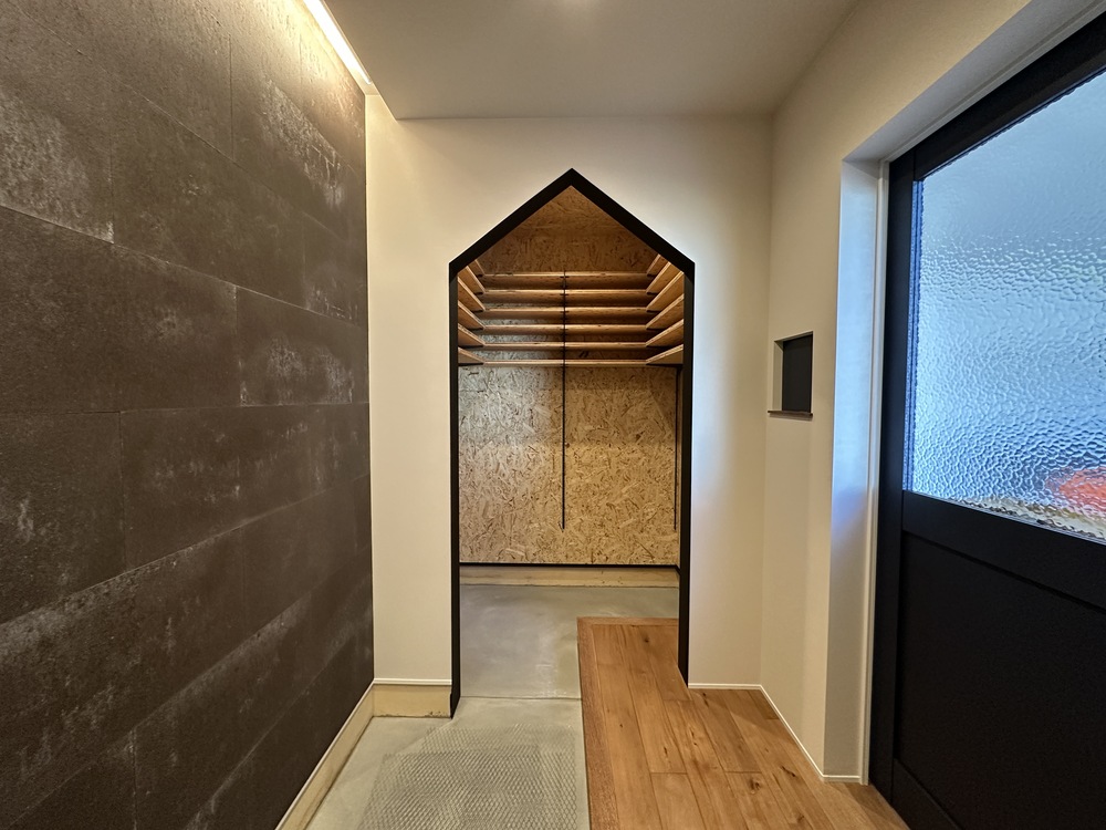 アイアンで縁取りした垂れ壁をくぐるとOSBボードのシューズクローゼット