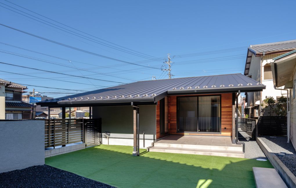 ガルバリウム鋼板〈8山〉のグリーンとレッドシダーを組み合わせた、カジュアルで温かみのある外観です。
