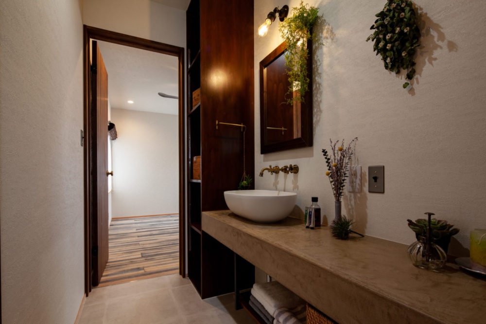 鏡や蛇口も、こんな感じのものがいいと伝えると、本当にその通りのものを探してきてくださるので、まさにイメージ通りの洗面に仕上がりました。