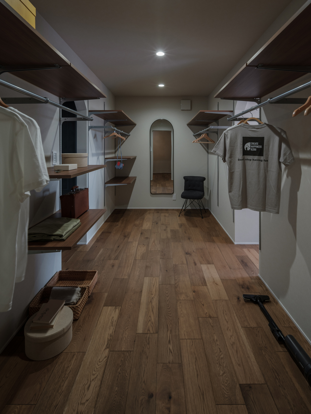 (奥様)私はウォークインクローゼットに理想があって、「お店のオープンシェルフのようにきれいに見えるデザインにしたい」と伝えました。どうやったらお店のように見えるか棚の幅など考えてくださり、大満足の形になりました。