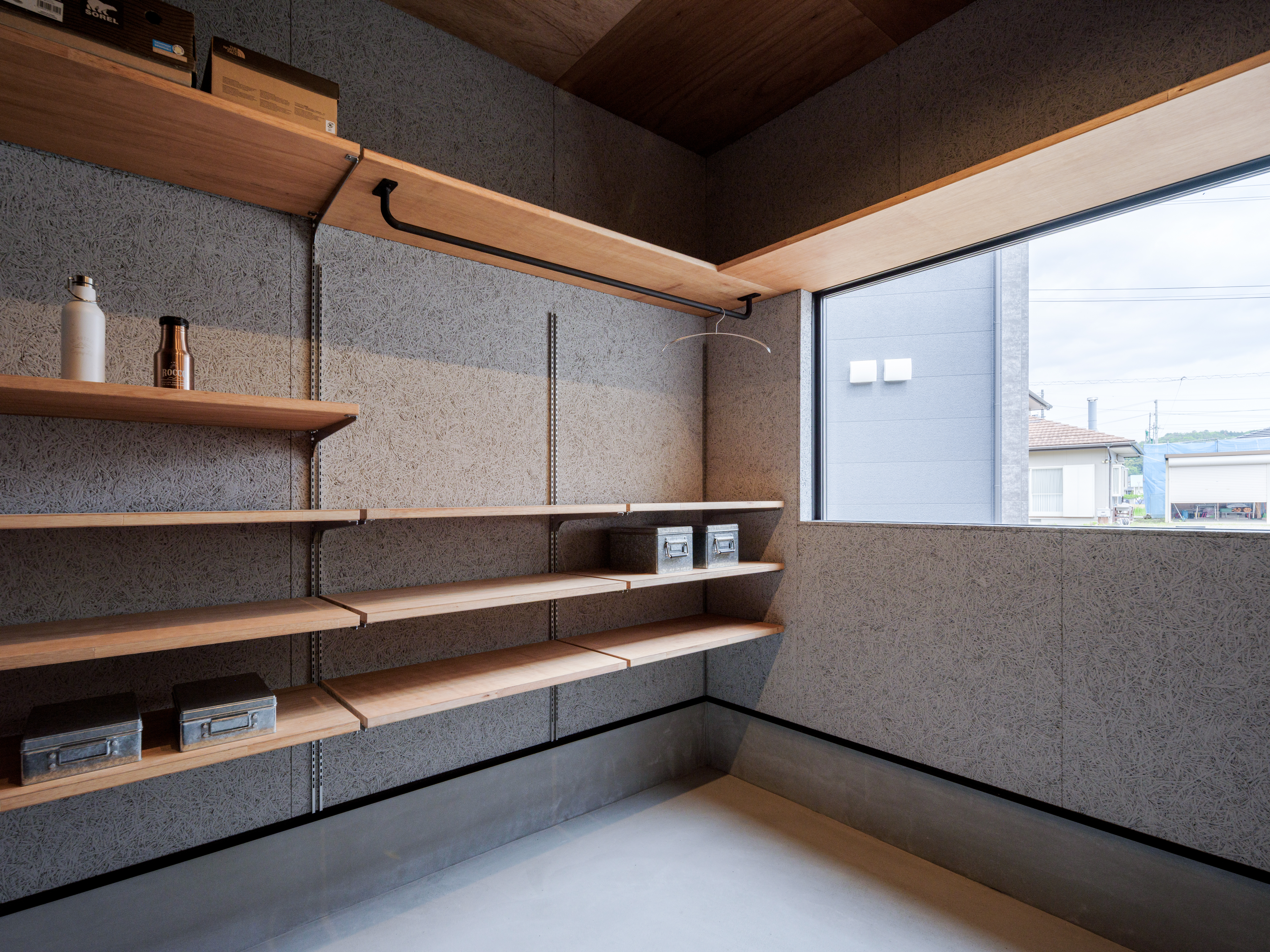 (旦那様)僕が一番思い入れがあったのが、ガレージ。「壁は白っぽく明るい感じで、見せる収納にしたい」と相談したら、木毛版の棚を提案してくれました。なかなかないデザインになったと思います。