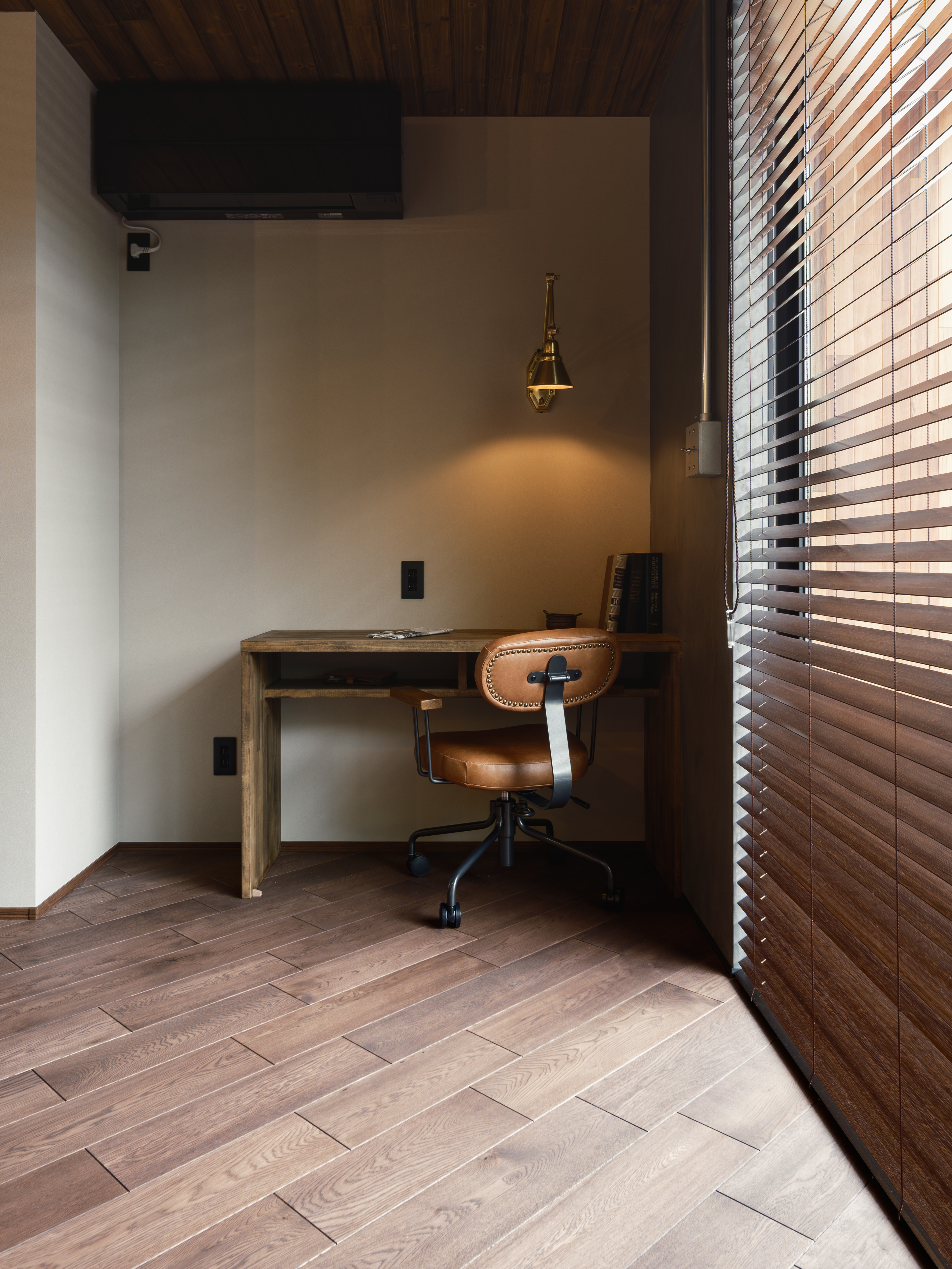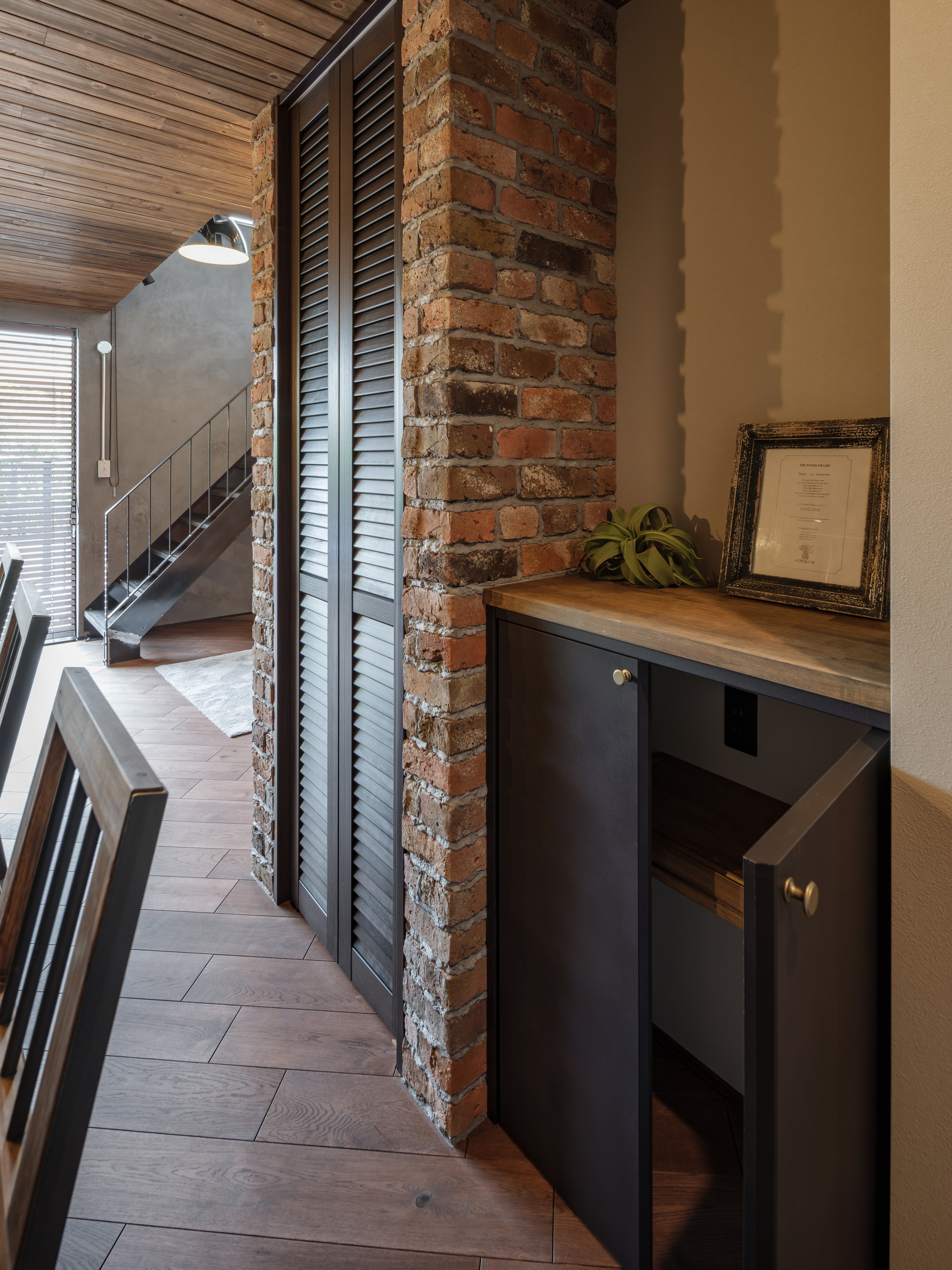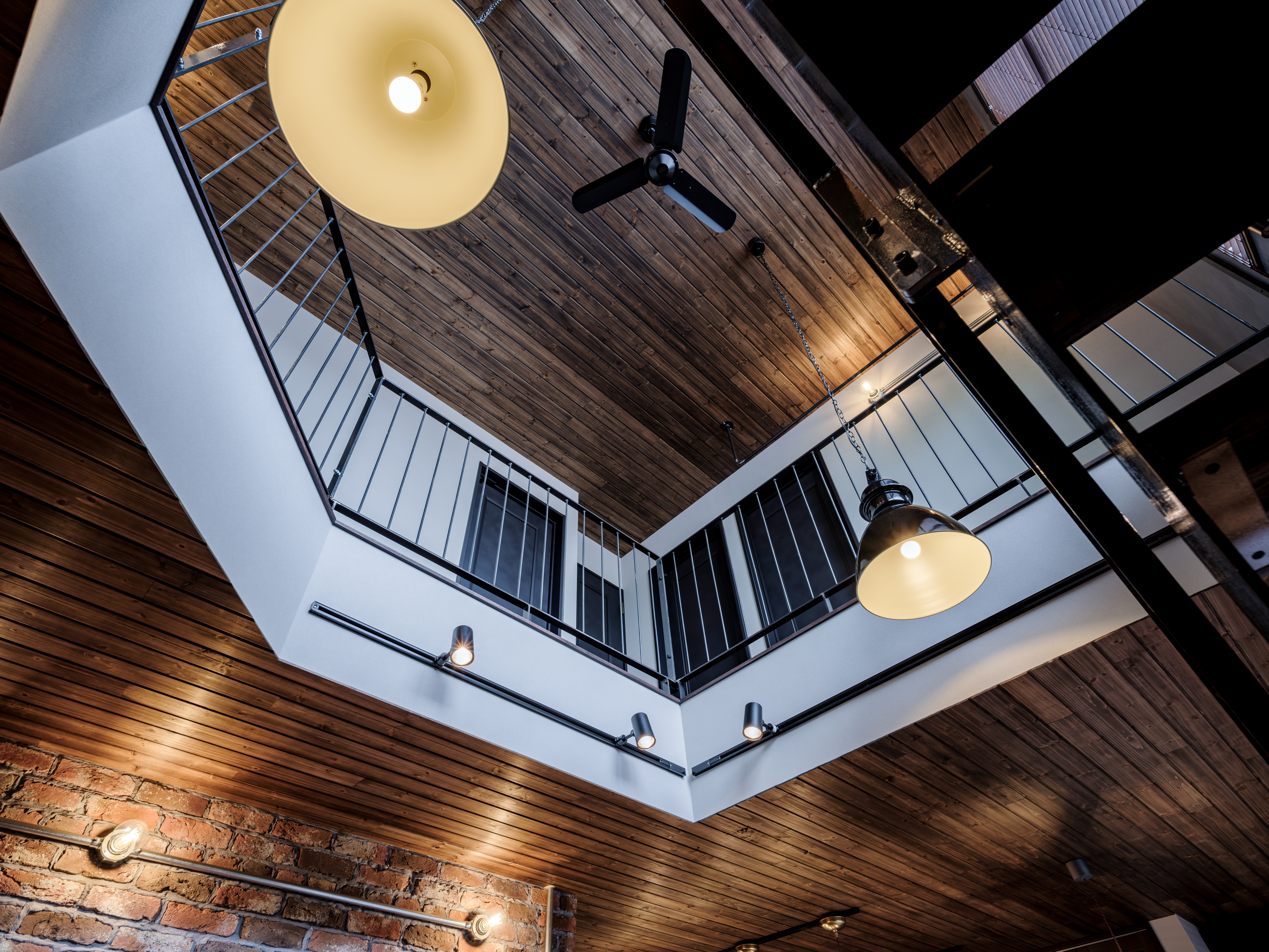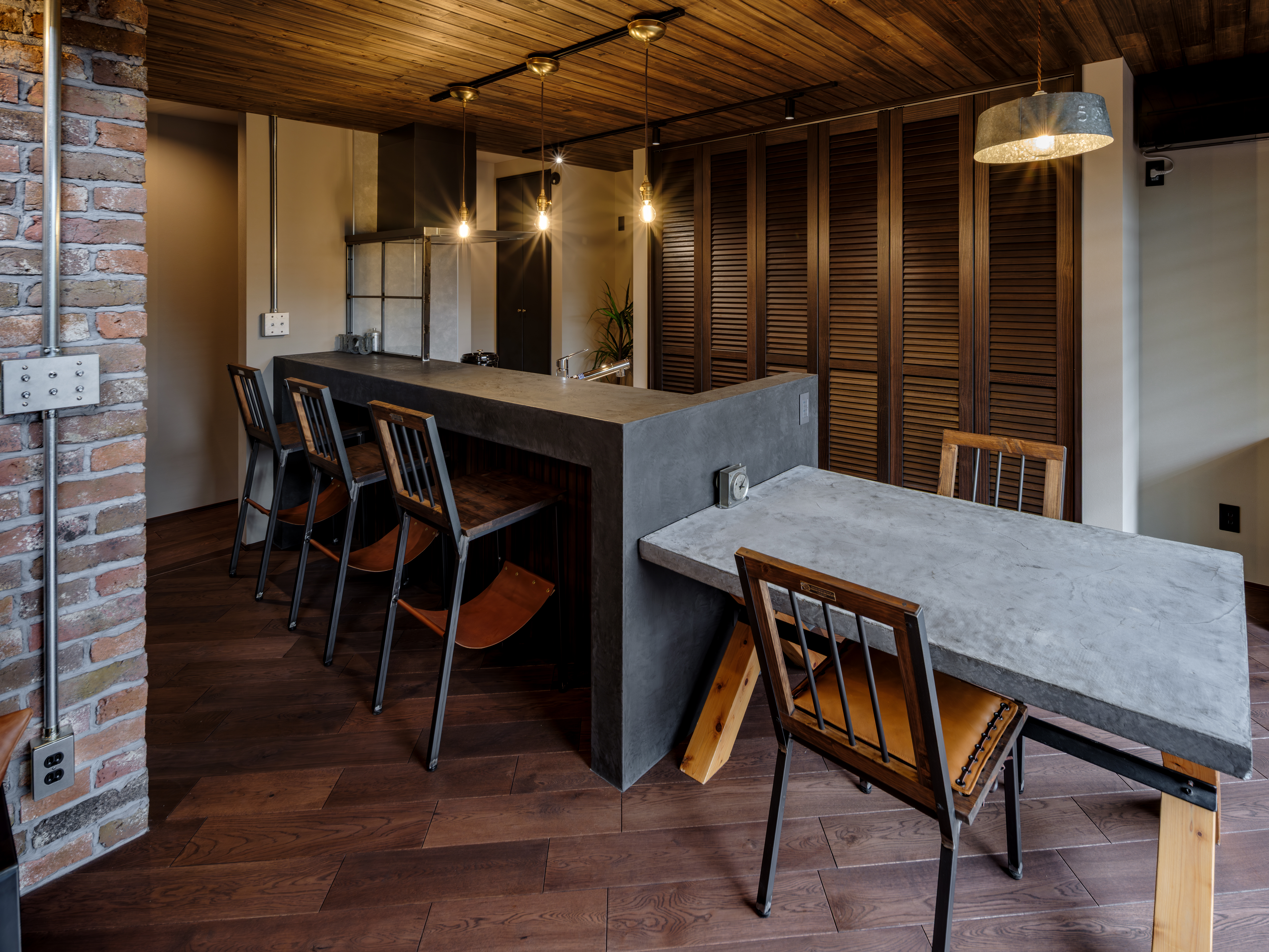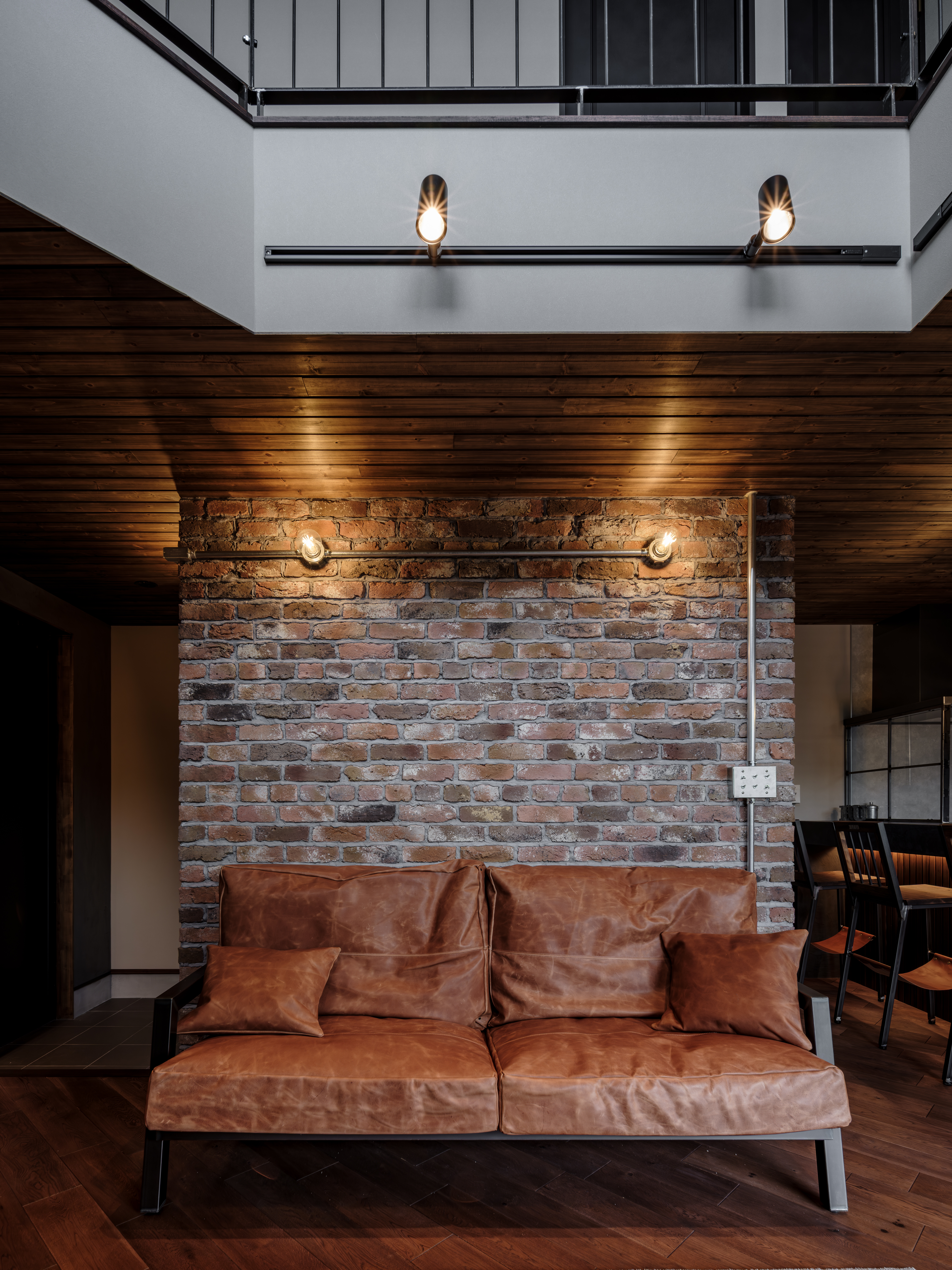 天井の板張り、レンガの質感、光の入り方、明るすぎない落ち着いた雰囲気。