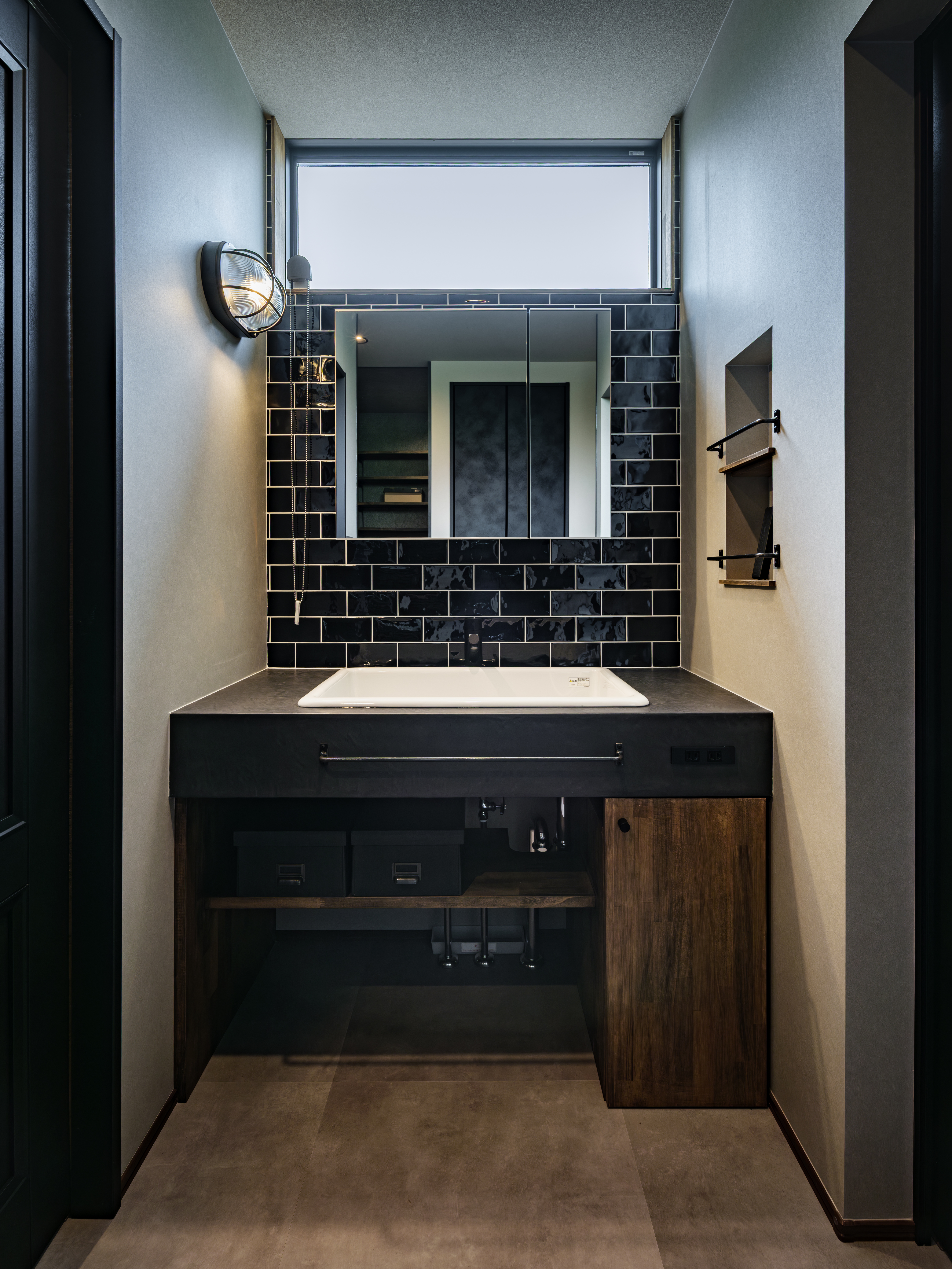 洗面の黒いタイルも、全面貼りにして正解でしたね。