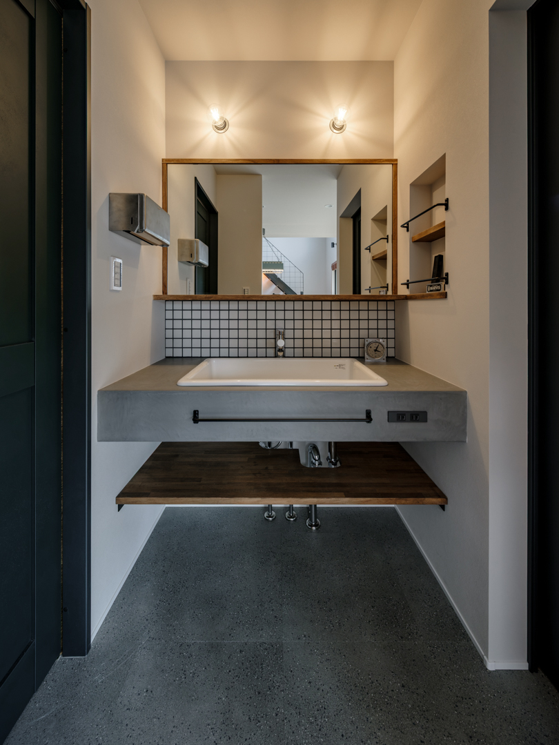 大きな一面鏡の洗面スペース