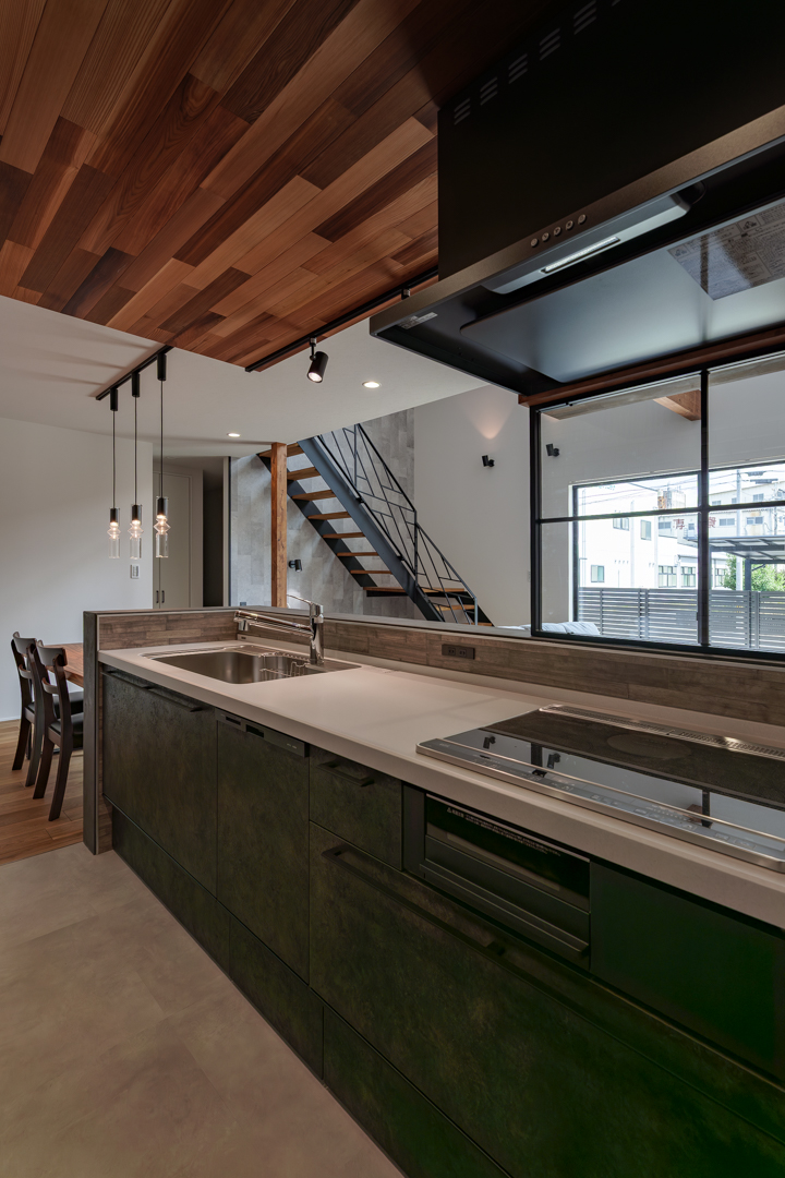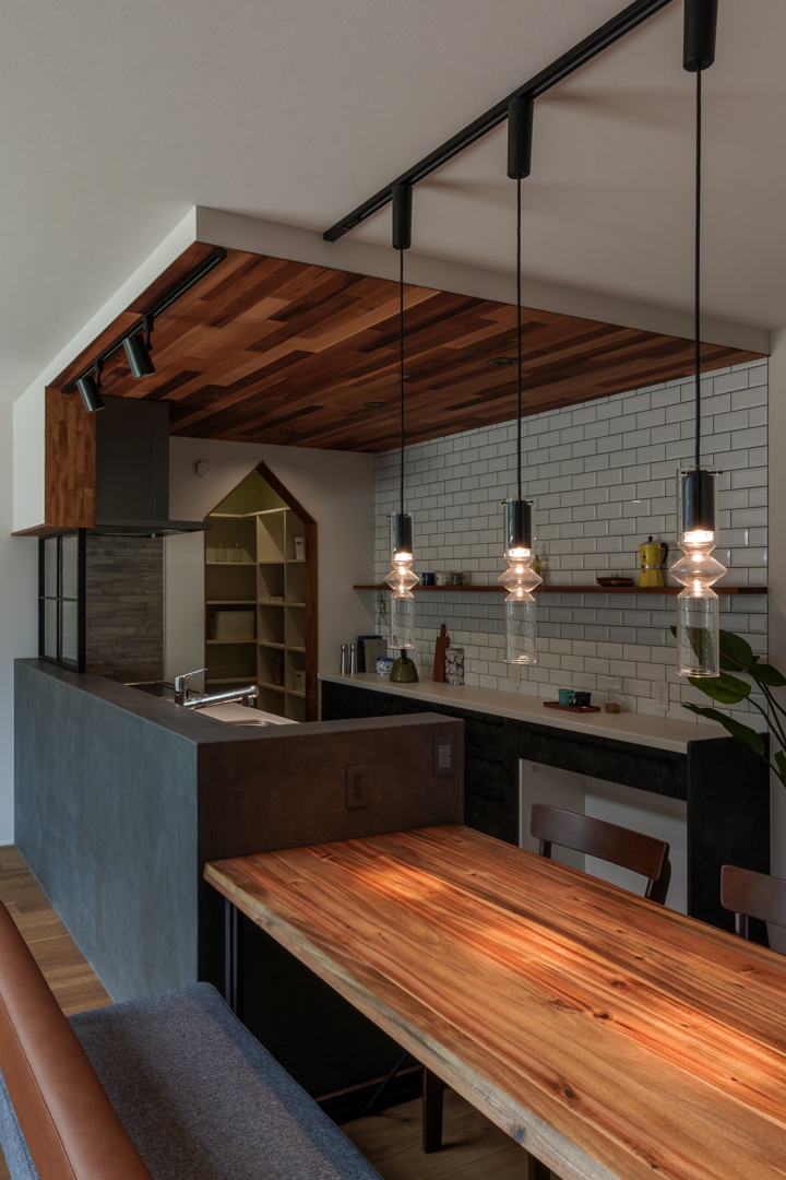 天井はレッドシダー板張り、キッチン背面は全面タイル貼り